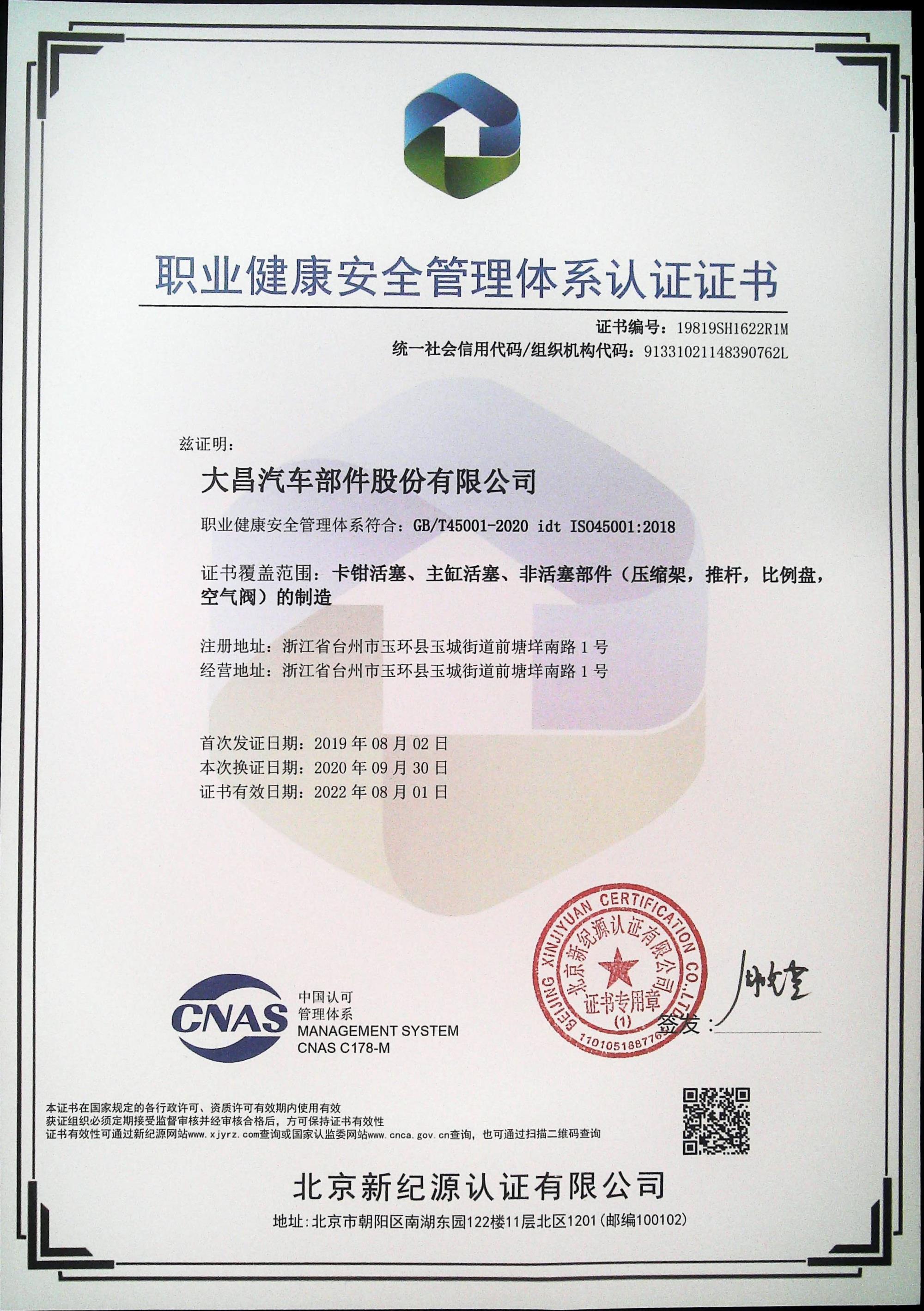 职业健康安全管理体系认证证书